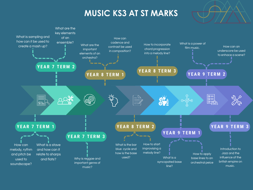 The Music Curriculum at St Mark’s CE school is about experiencing live and digital music through creativity and performance. A high quality musical education engages and inspires students to develop a love of music. They harness their talents as a musician and performer, developing their self confidence, creativity and a sense of achievement and well being. Music at St Mark’s creates a sense of identity and self worth, it provides an outlet for creativity, self expression and individual uniqueness. For many of our students music is a life changer – performing music and indeed their particular instrument becomes part of who they are and they take this with them wherever they go.